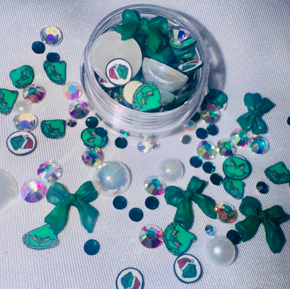 More fancy mix with green bows 2 grinch faces Fimo. Ab Crystals green rhinestones & white pearl mix