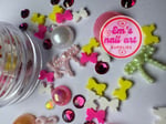 Cutie mix is rhinestone and pearls with bow charms and Fimo bows