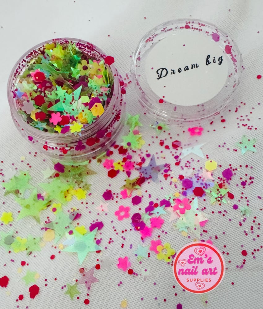 Gorgeous glitter mix of stars flowers small red glitter. 3g pots