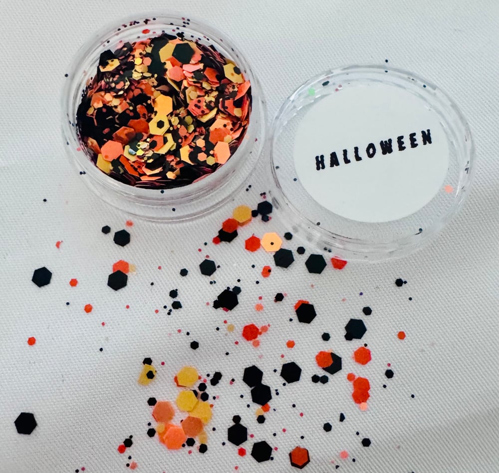 Halloween glitter in Halloween colours orange black yellow. 3G pot