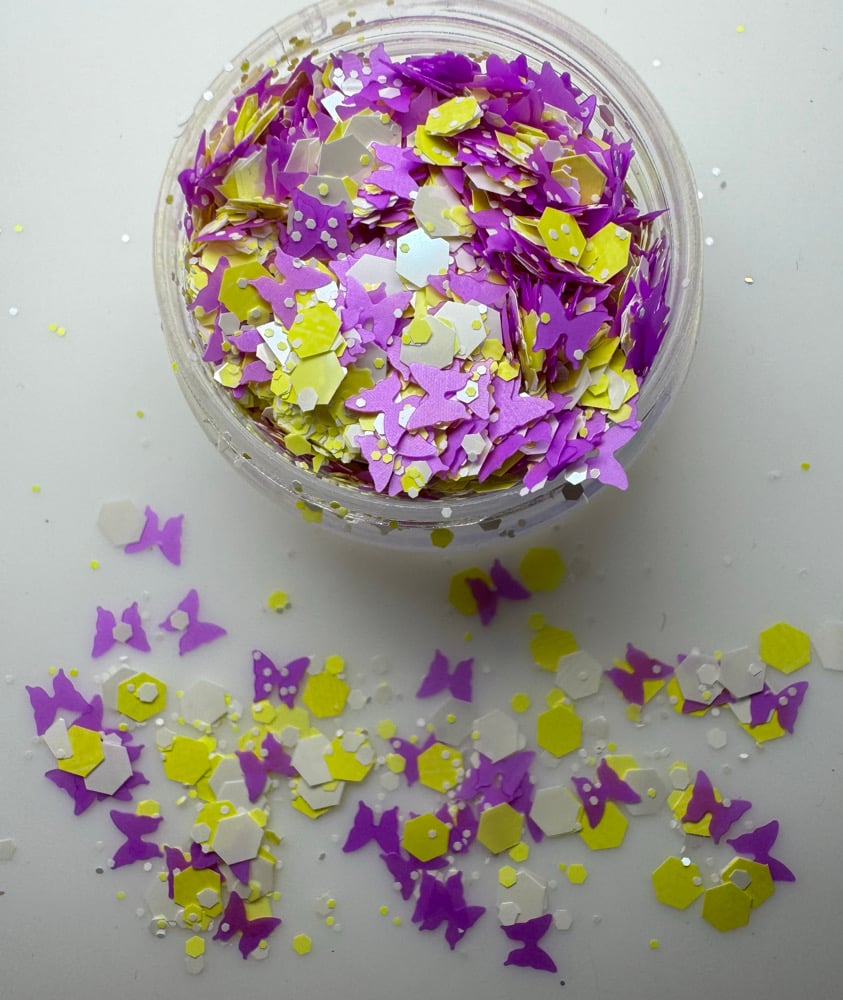 Luna mix is a Matt yellow and white glitter with purple butterfly’s
