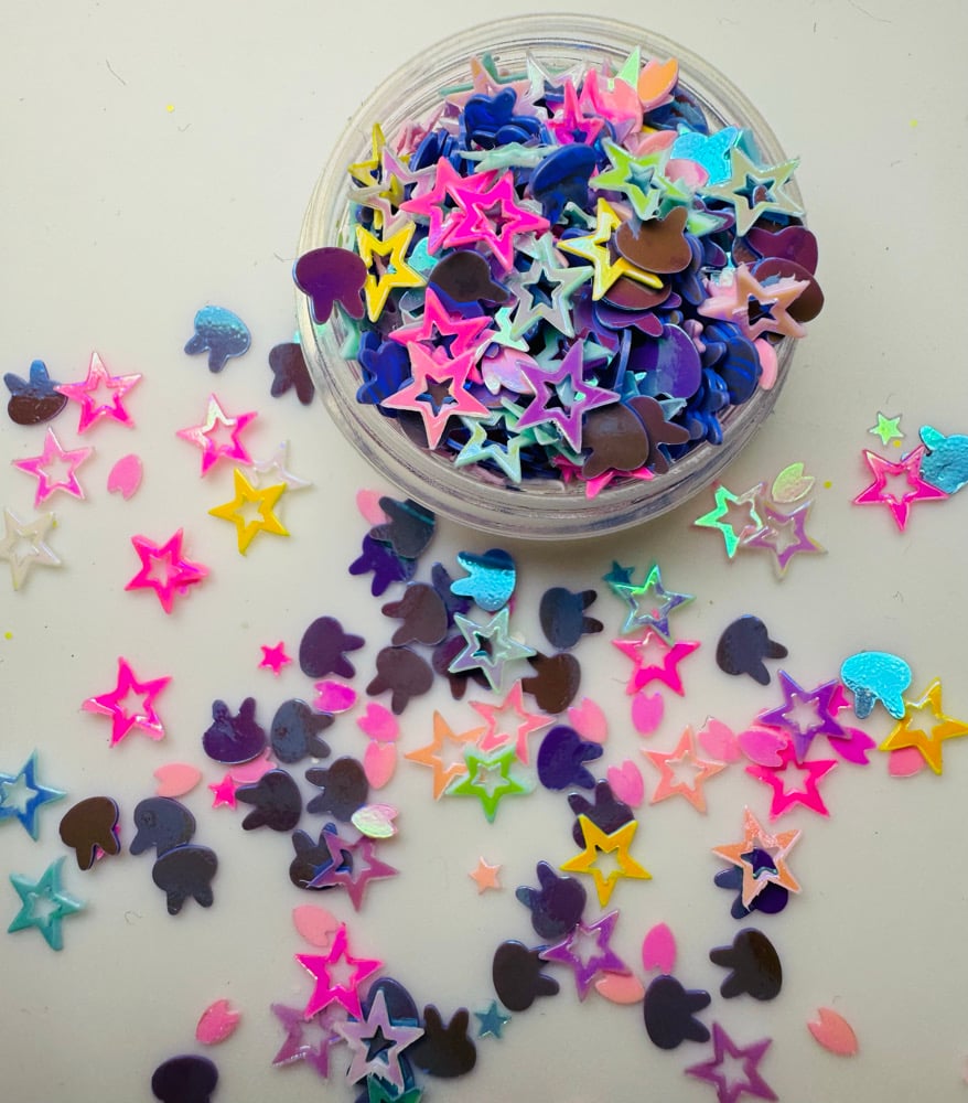 Snuggle bunnies glitter mix is purple bunnies with multi coloured stars and pink petals