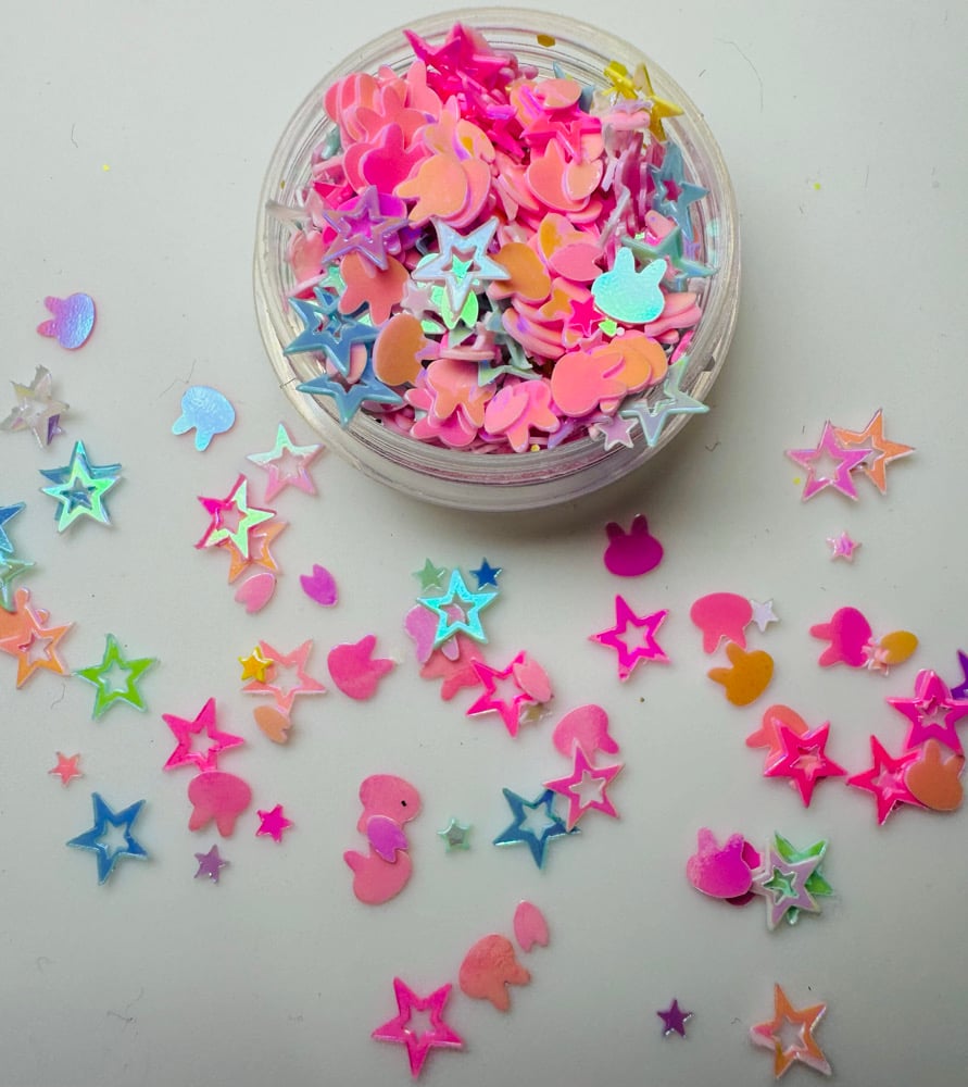 Sparkle bunnies glitter mix is purple bunnies with multi coloured stars and pink petals